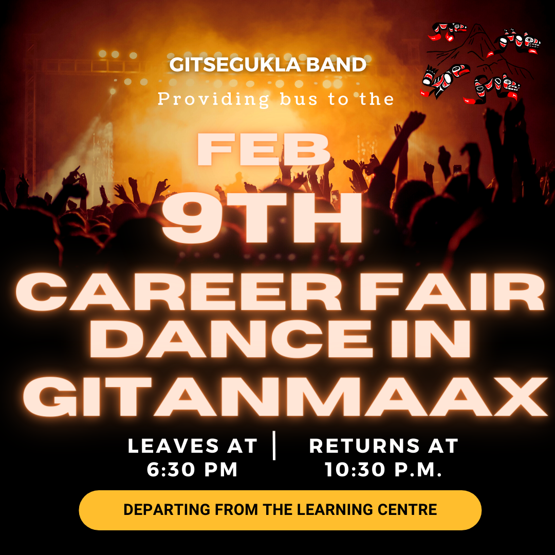 The Bus leaves the Gitsegukla Learning Centre at 12:00 PM, that way you to can ride with your friends to attend the Career Fair.